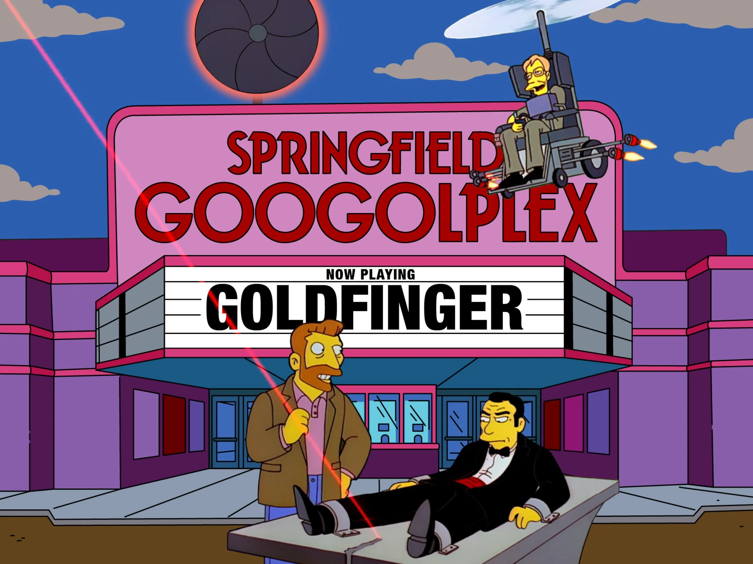 Of course, variations on the movie’s famous laser sequence also make several appearances, from Bart’s tattoo removal in the pilot episode to an episode of Itchy & Scratchy to Scorpio’s trap for James Bondt (yes, “Bondt”). Likewise, Goldfinger himself has been sent up in “Who Shot Mr. Burns,” when Springfield’s own supervillain reveals his plan to block out the sun using a scale model of the city.
