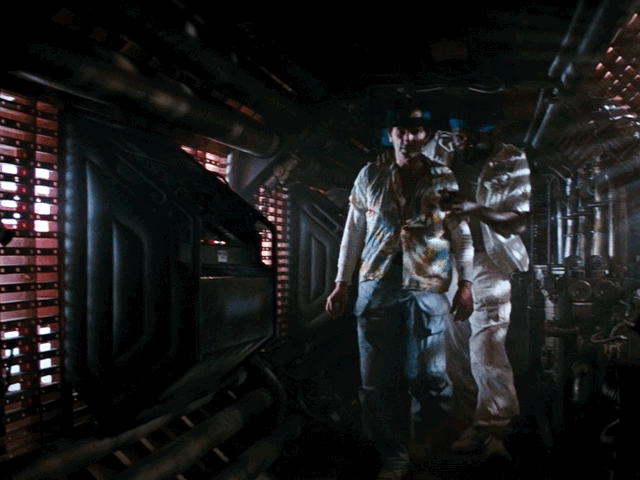 New • Treehouse of Horror (S2E3): On the commentary for this episode, David Silverman notes that some of the corridors on Kang and Kodos’s spaceship were modeled after Alien. Upon closer inspection, we think the moment where Lisa runs around a corner is modeled after a similar shot where Brett and Parker have a walking conversation.