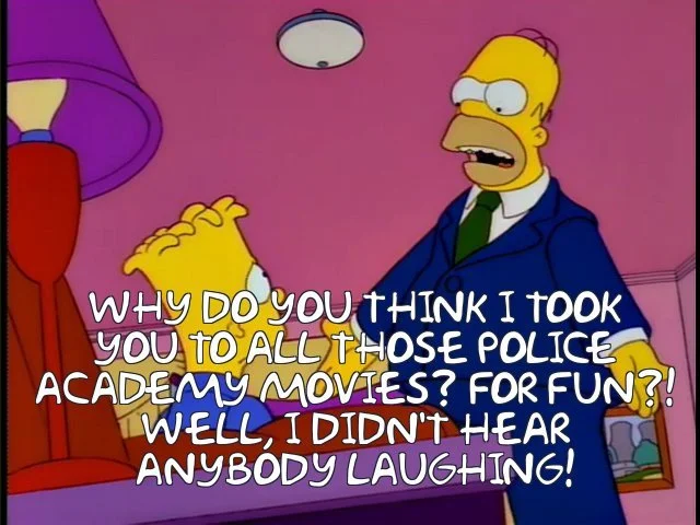 Marge Be Not Proud (S7E11): When Bart’s parents catch him shoplifting, Homer gives him a long, rambling speech. At one point, he says, “Why do you think I took you to all those Police Academy movies, for fun?! Well, I didn't hear anybody laughing! Did you?! Except at that guy who made sound effects.”