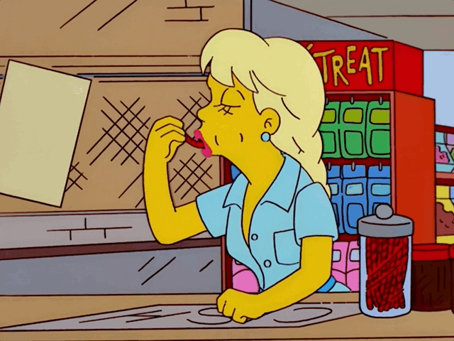 Whether or not it’s a reference to Audrey, Selma demonstrates this trick with a cigarette in her video for a dating service, and later, Annette the Squishee Lady tops both of them by spelling “do me” with red licorice for Apu. The first instance on The Simpsons took place in 1993, three years after the Twin Peaks episode and two years before Brooke Shields would further popularize this trick on The Tonight Show with Jay Leno.